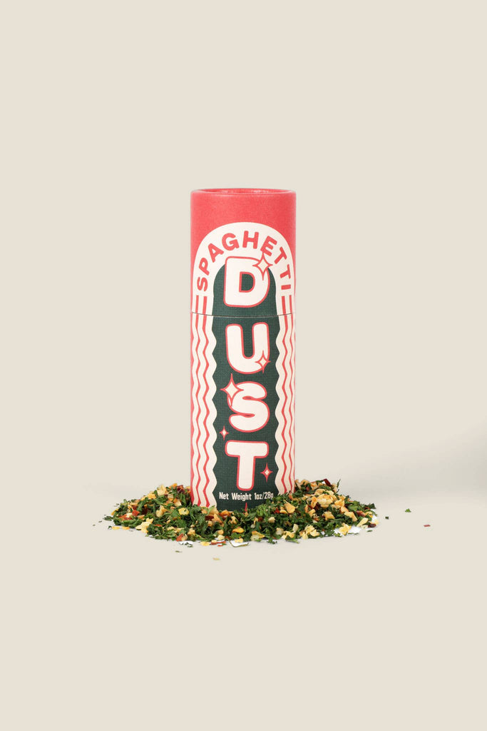 Spaghetti Dust is our ready-to-go tube of traveling Aglio, Olio e Peperoncino. The idea is that you drain your al dente! pasta and toss it in a bowl with your Spaghetti Dust and ≈ 1/3 cup of high-quality Extra Virgin Olive Oil, then serve immediately at the table or, if it's been a late night, you consume it entirely and directly on the kitchen counter.