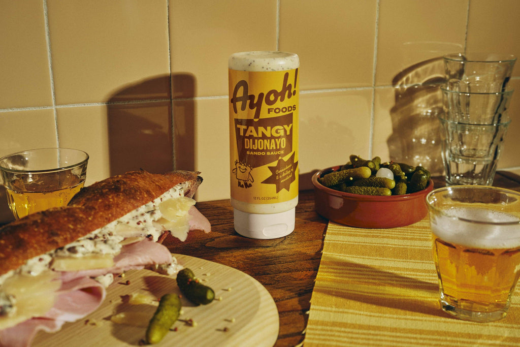 Tangy Dijonayo As a great man once said, “If this is not in your fridge, you’re slippin'.” Tangy Dijonayo is a snappy blend of spicy Dijon and whole-grain mustard with the sweet acidity of crunchy cornichons. Filled to the brim with bits and bobs, this is your one-stop Sando Sauce. Look no further. (But you should probs also try the others.) Tangy Dijonayo packs an undeniably pleasurable punch.