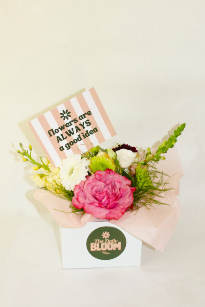 Meet our it-girl bouquet. The Daily Bloom is a designer’s choice bundle or arrangement, made fresh each morning with the best seasonal flowers and colors. Always changing, always iconic. Want it arranged in a vase? Add a vase to your cart and we'll put the blooms inside a neutral or glass container.