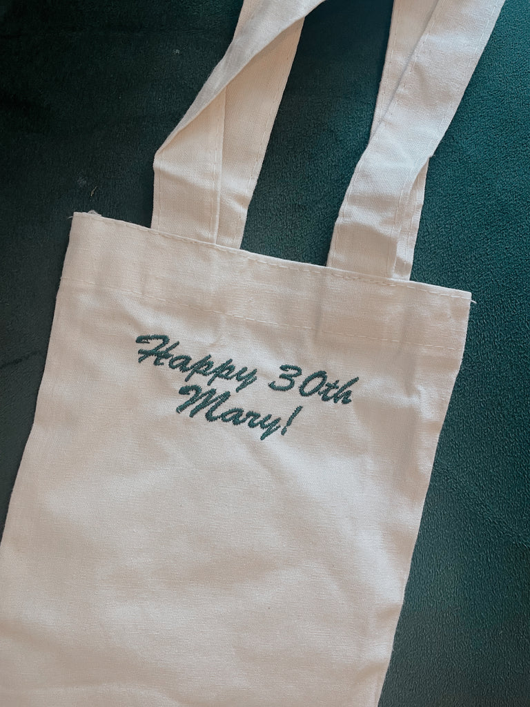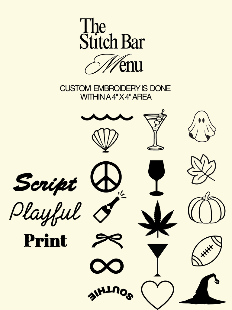 Personalized, playful, and handmade with love! Our custom embroidery collection is the perfect way to celebrate, gift, or elevate the everyday. Each piece is made to order in our studio and ready within 10 days of placing your order. By purchasing a custom order, you are agreeing that you've read all the below information. Some fonts are not available for all items due to materials. Thank you!