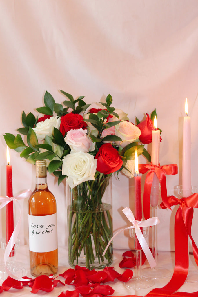 For custom color requests, please make sure to give a minimum of 24 hours notice. All mixed bouquets and roses can be made in custom color palettes. Currently our designer's choice color palette is pink, white and green. Roses can come in red, white, pink or mixed. Please include your rose color preference in the "add your note" section in the cart.