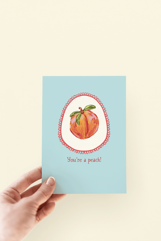 Let someone know they're just peachy with this 5x7 card, featuring a colorful peach with the phrase "You're a peach!". The card is blank inside for your own personal message, and comes with a brown kraft envelope. Perfect for friends, thank yous, just because, thinking of you, and more!